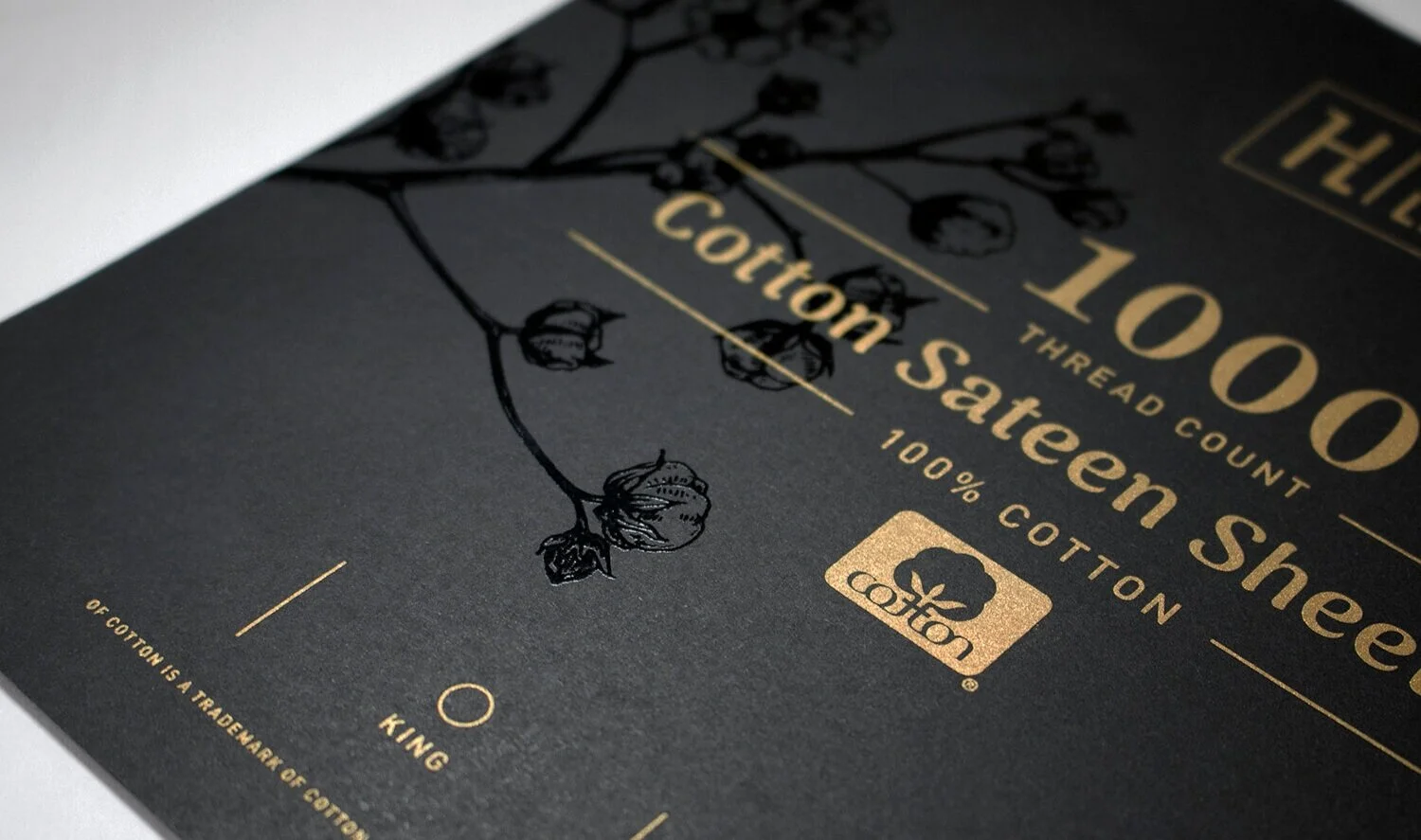 The 400 thread count sheet set and fitted sheet utilize natural colors and clean lines while the high-end 1000 thread count sheet set is elevated by metallic gold print and spot varnish tone-on-tone graphics.